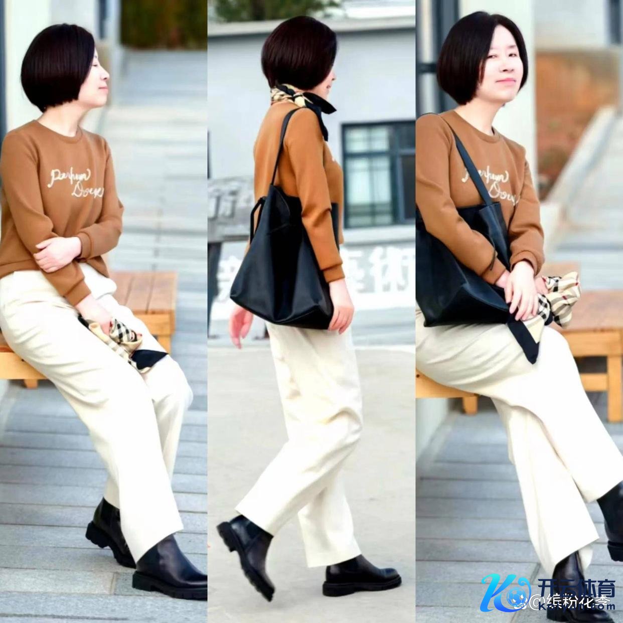 秋冬季的棕色圆领卫衣,搭配米色直筒裤,玄色短靴和包包点缀,打造一个同色系不同浅深搭配,调和有端倪感。外出时系上一条黑棕格纹丝巾,仁爱、优雅、前锋,适合大多半50+女性。