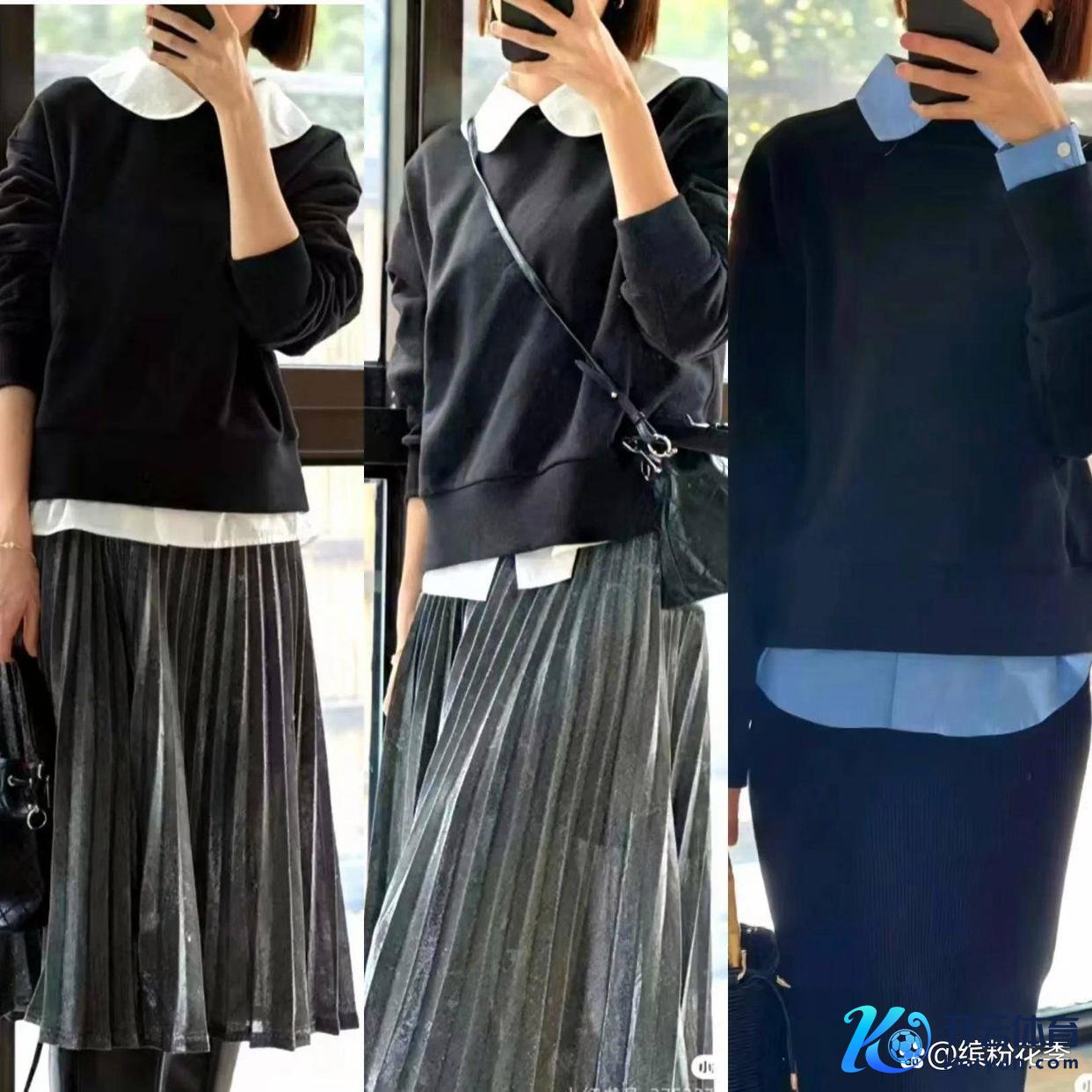 灰色圆领卫衣叠穿白衬衫,搭配同色系百褶半裙,透露白色领子和前衣摆,增多造型亮点。举座神采浅薄有端倪感,展现出50+女性优雅不失失业气质。