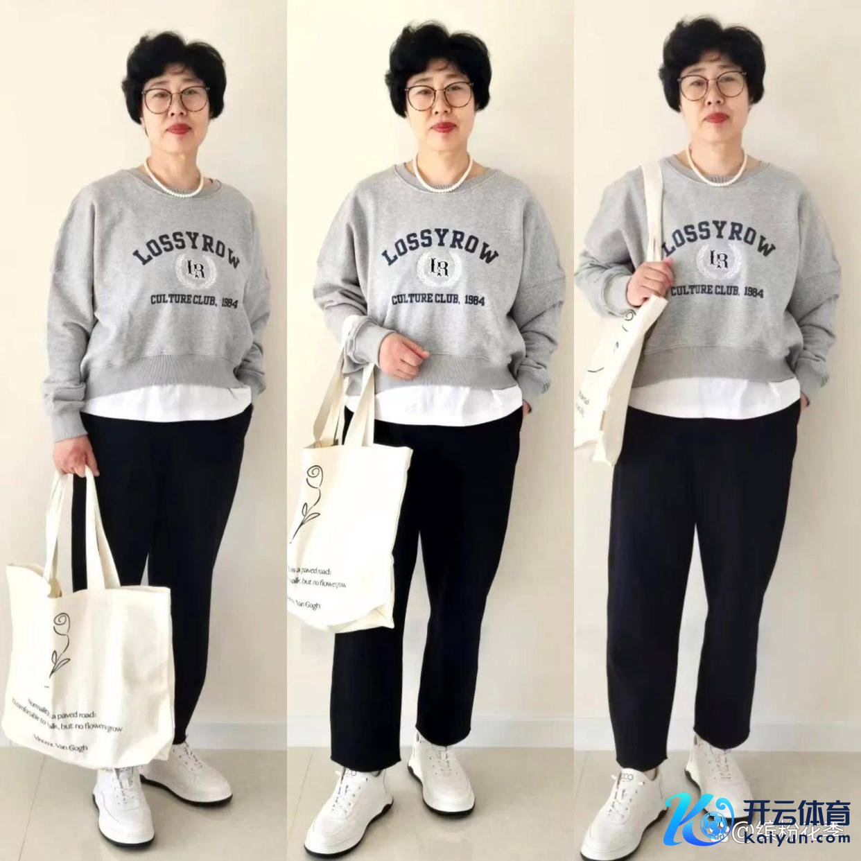 灰色字母卫衣,搭配玄色失业裤一稔。白色默契鞋与透露的白色T恤衣摆神采呼应,举座詈骂灰搭配。珍珠项链增多造型质感,展现出50+女性失业不失机尚造型,悦目显年青。