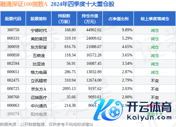 融通深证100指数A为指数型-股票基金,把柄最新一期基金季报披露,该基金金钱建设:股票占净值比94.72%,债券占净值比0.29%,现款占净值比5.19%。基金十大重仓股如下: